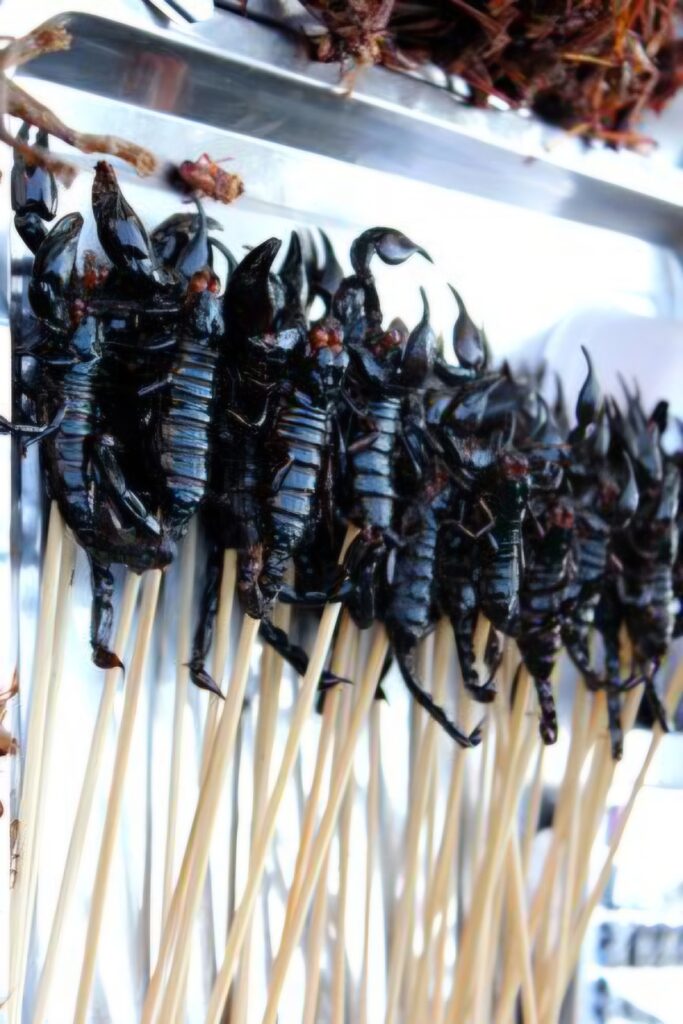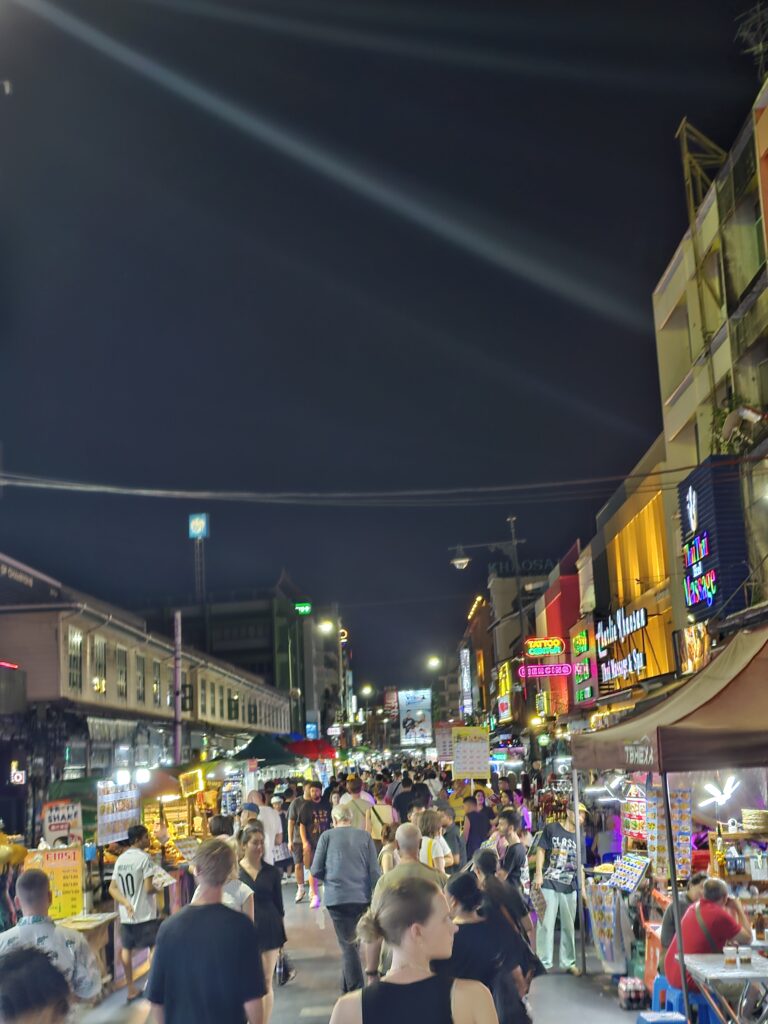Zur Auffrischung unseres Abenteuergeists sind wir anschließend Richtung der berühmten und berüchtigten Khao San Road marschiert. Und dort hat uns eine Atmosphäre empfangen, die man eigentlich nur als „kontrolliertes Chaos mit Entertainment-Garantie“ beschreiben kann. Zwischen Spießen mit schwarzen Skorpionen, knusprig frittierten Würmern und gegrilltem Krokodil wirbelten die Düfte des Streetfoods durcheinander. Aus den Pubs an der Straße dröhnte die Musik der DJs, während ein paar Ladyboys wild tanzend auf Tischen ihre eigene kleine Show hinlegten. Zwischendrin kamen Angebote für Lachgasballons und – natürlich – die unvermeidliche Ping-Pong-Show, die einem an jeder Ecke geflüstert wird. Kurz gesagt: Die Khao San Road ist ein Ort, an dem man in wenigen Minuten mehr Kuriositäten sieht als anderswo in einer ganzen Woche.