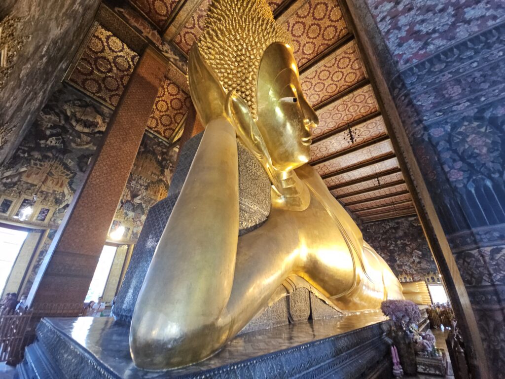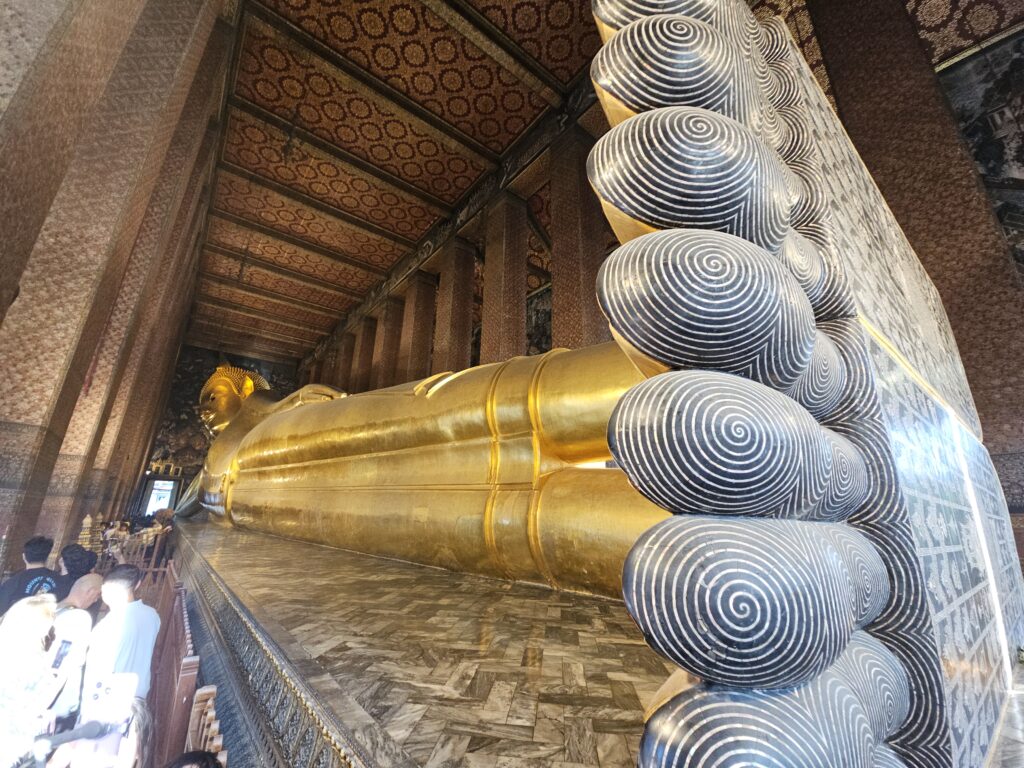 Weiter ging’s zum berühmten Wat Pho, wo der 46 Meter lange liegende Buddha so groß ist, dass man beim Fotografieren überlegen muss, ob man ein Panorama machen oder sich einfach in die Luft katapultieren lassen sollte. Man beginnt am Kopf, geht 20 Schritte, und plötzlich denkt man: „Ah! Da ist ja immer noch Buddha!“