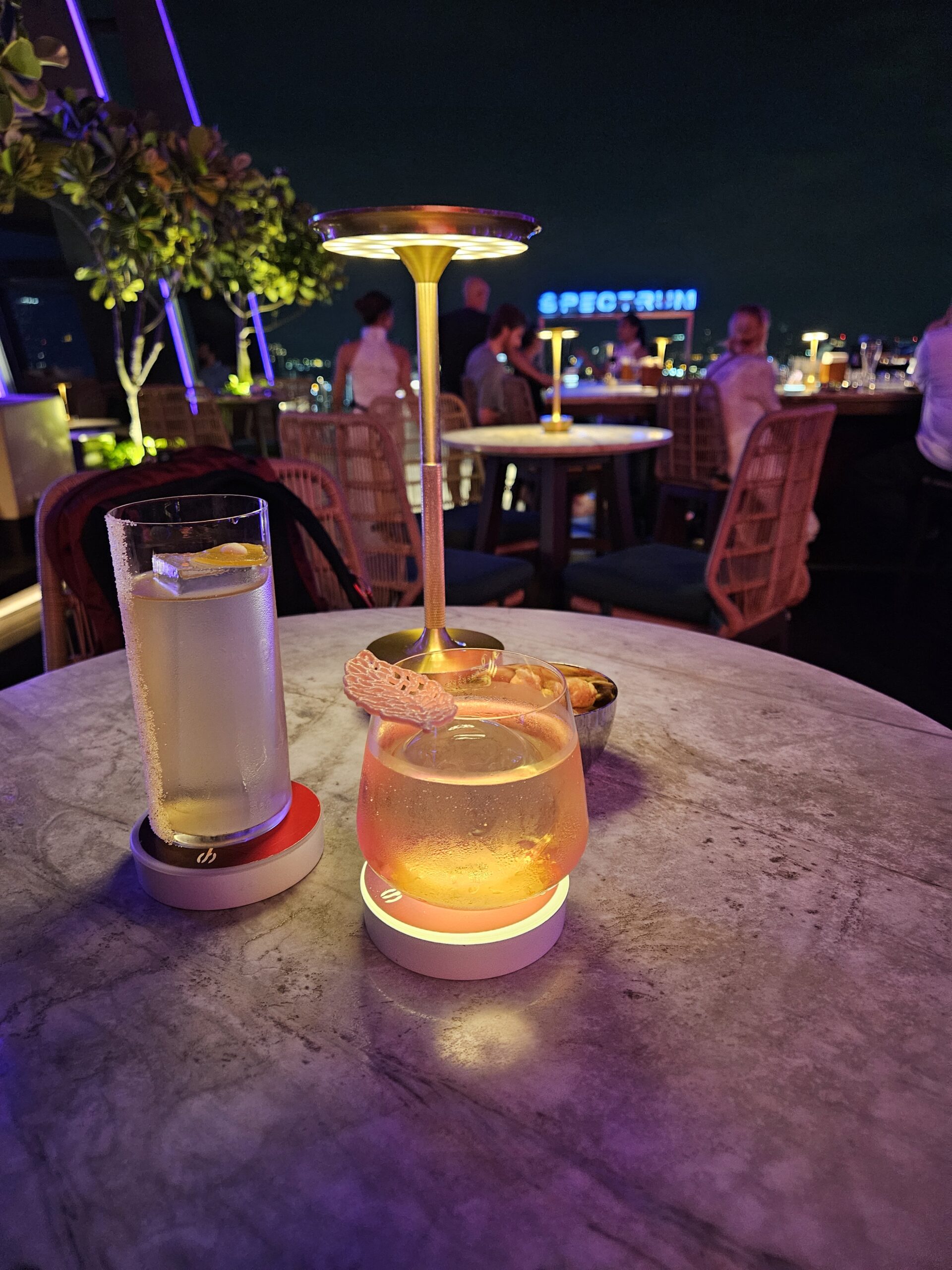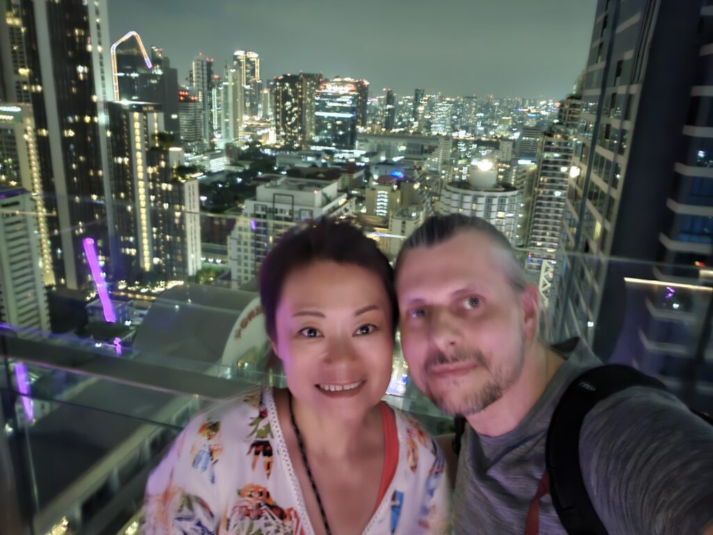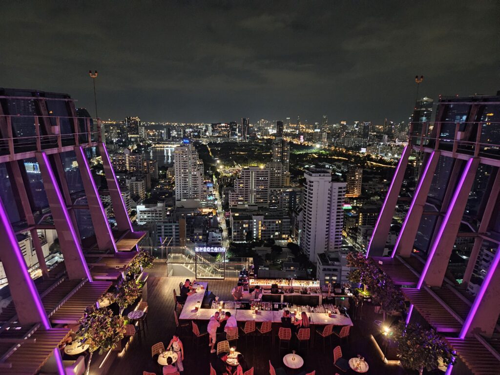 Bei der Suche nach einer halbwegs „seriösen“ Abendlokation (man will ja zumindest anfangs so tun, als hätte man Stil) stolperten wir über eine Rooftop-Bar in 142 Metter Höhe auf dem Dach eines Luxushotels. Dort oben präsentierte sich uns Bangkoks moderne Seite – glänzend, schillernd und so hoch, dass selbst Google Maps kurz Schnappatmung bekam. Der Ausblick auf das nächtliche Bangkok war einfach traumhaft… so traumhaft, dass wir fast vergessen hätten, unser Getränk für mindestens 30 € zu trinken, bevor es warm wurde.