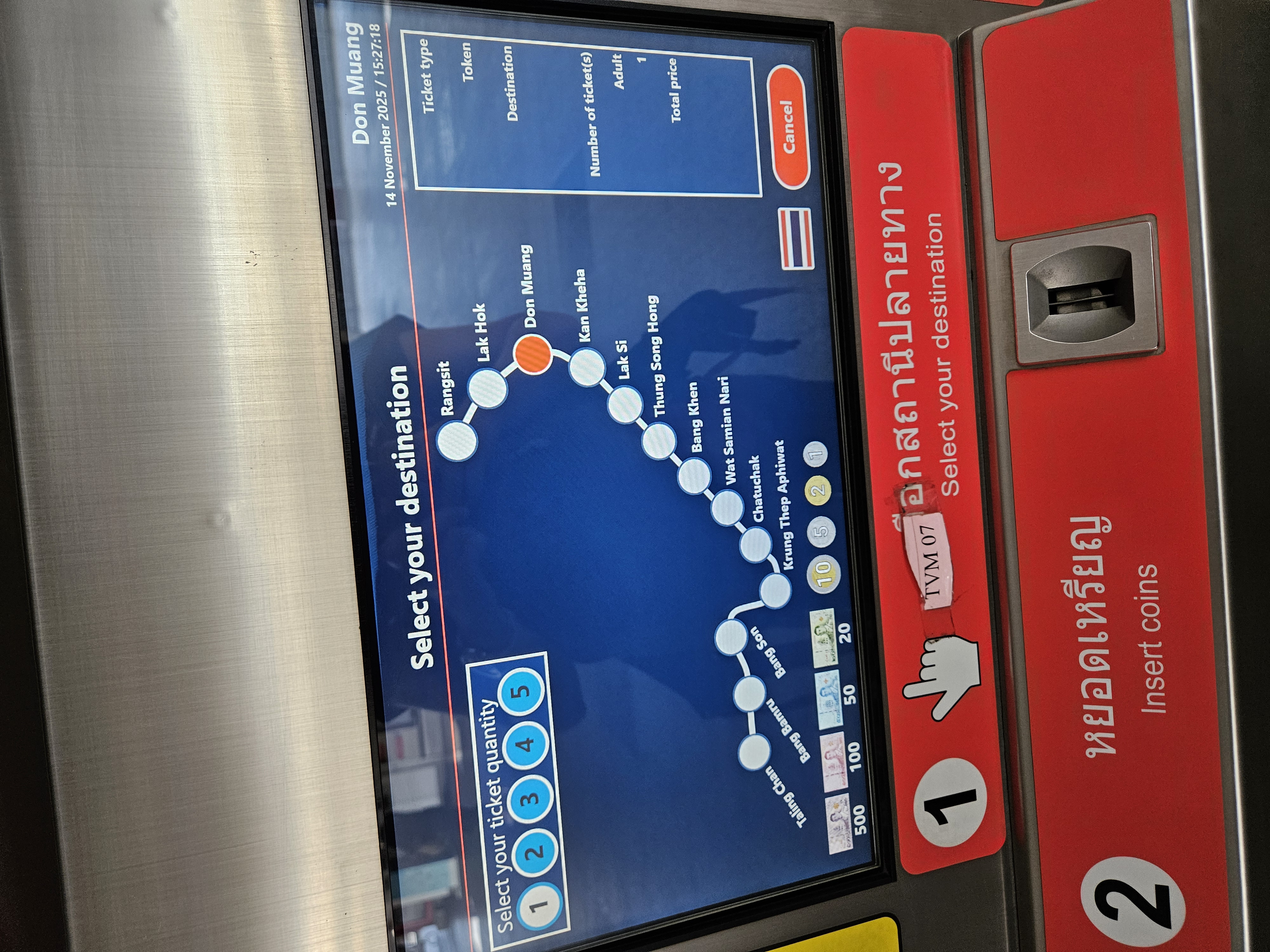 Wir haben dann beschlossen: „Ach, wir probieren es einfach!“ Also 40 Baht in Münzen eingeworfen – und der Automat hat uns zwei kleine schwarze Chips ausgespuckt, als würden wir gleich ins Casino statt in die Stadt fahren. Rein kommt man, indem man den Chip brav auf den Ticketschrank-Magnet-Sensor hält. Raus kommt man, indem man ihn wieder einwirft. Sehr retro, sehr charmant – und wir sind immerhin angekommen!
