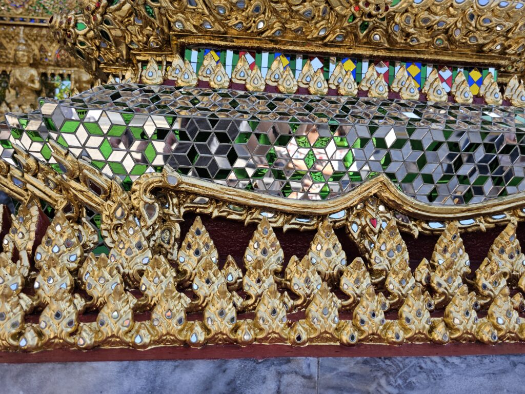Im Anschluss ging es zum Tempel Wat Phra Kaeo wo uns 178 Wandmalereien, wie ein riesiges Bilderbuch der thailändischen Mythologie, erwarteten. So detailliert, dass man minutenlang auf dieselbe Wand starrt und immer noch neue Figuren entdeckt: https://www.royalgrandpalace.th/en/discover/architecture/1/the-cloisters
