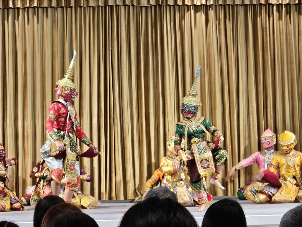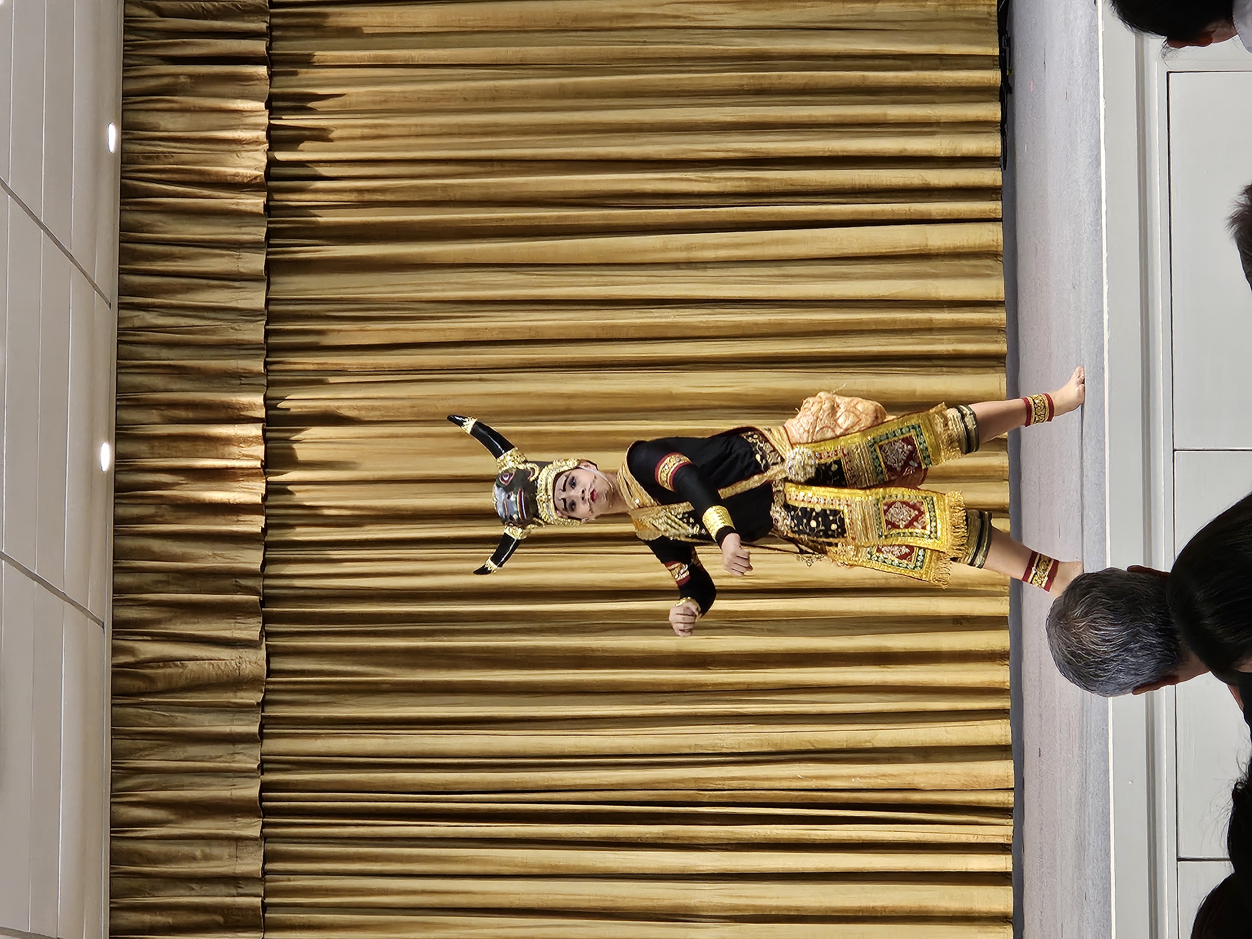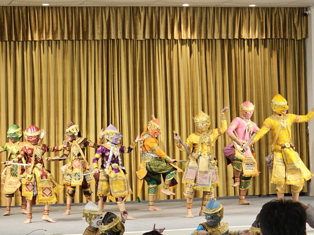 Kaum losgelaufen, wurden wir schon aufgehalten – diesmal nicht vom Verkehr, sondern von einer Gruppe junger Leute, die traditionellen Thai-Tanz in einem Saal aufführten. Total süß! Wir gehen hinein und setzen uns hin, nickten im Rhythmus mit und taten so, als würden wir die Tanzschritte verstehen.