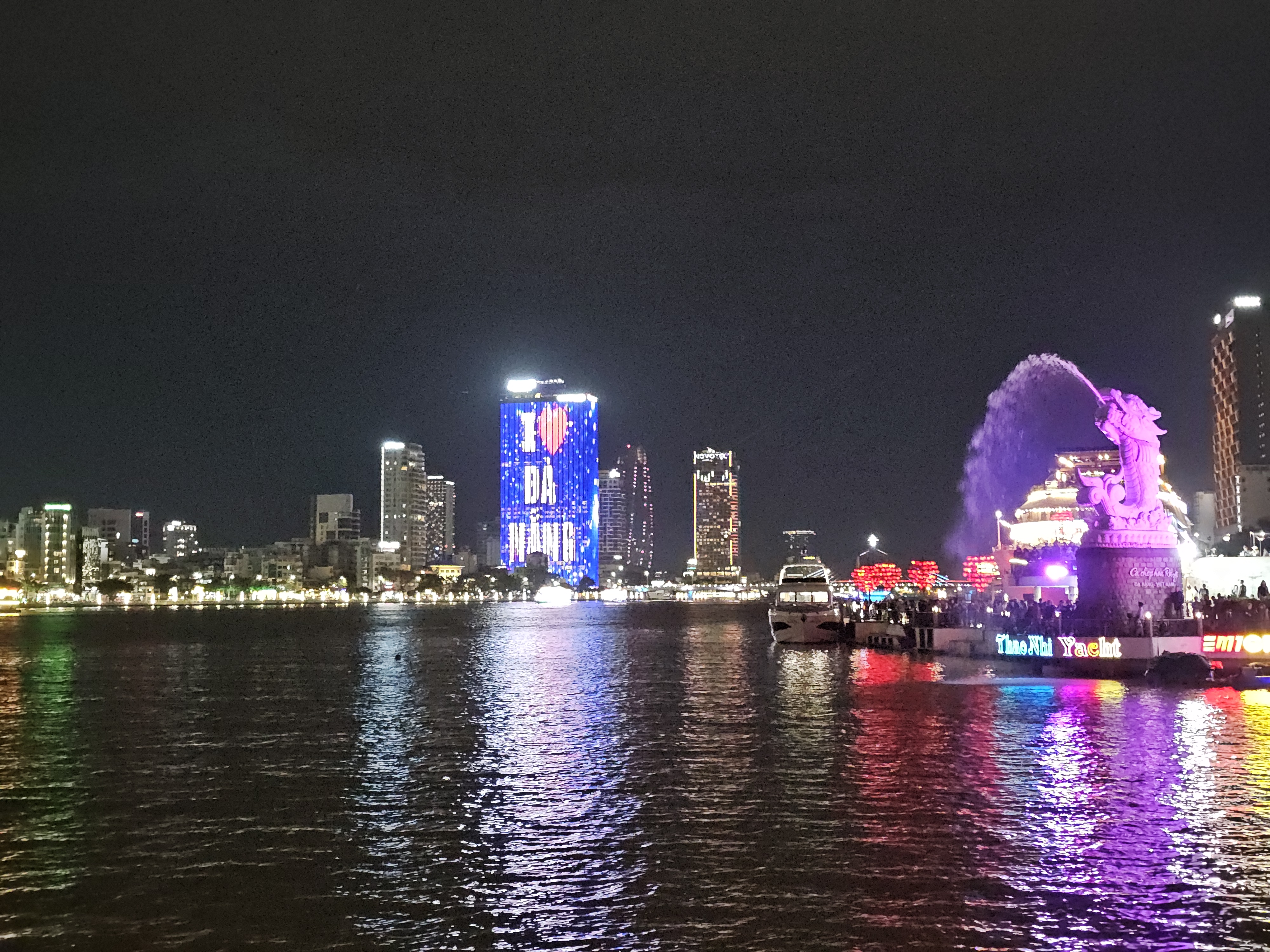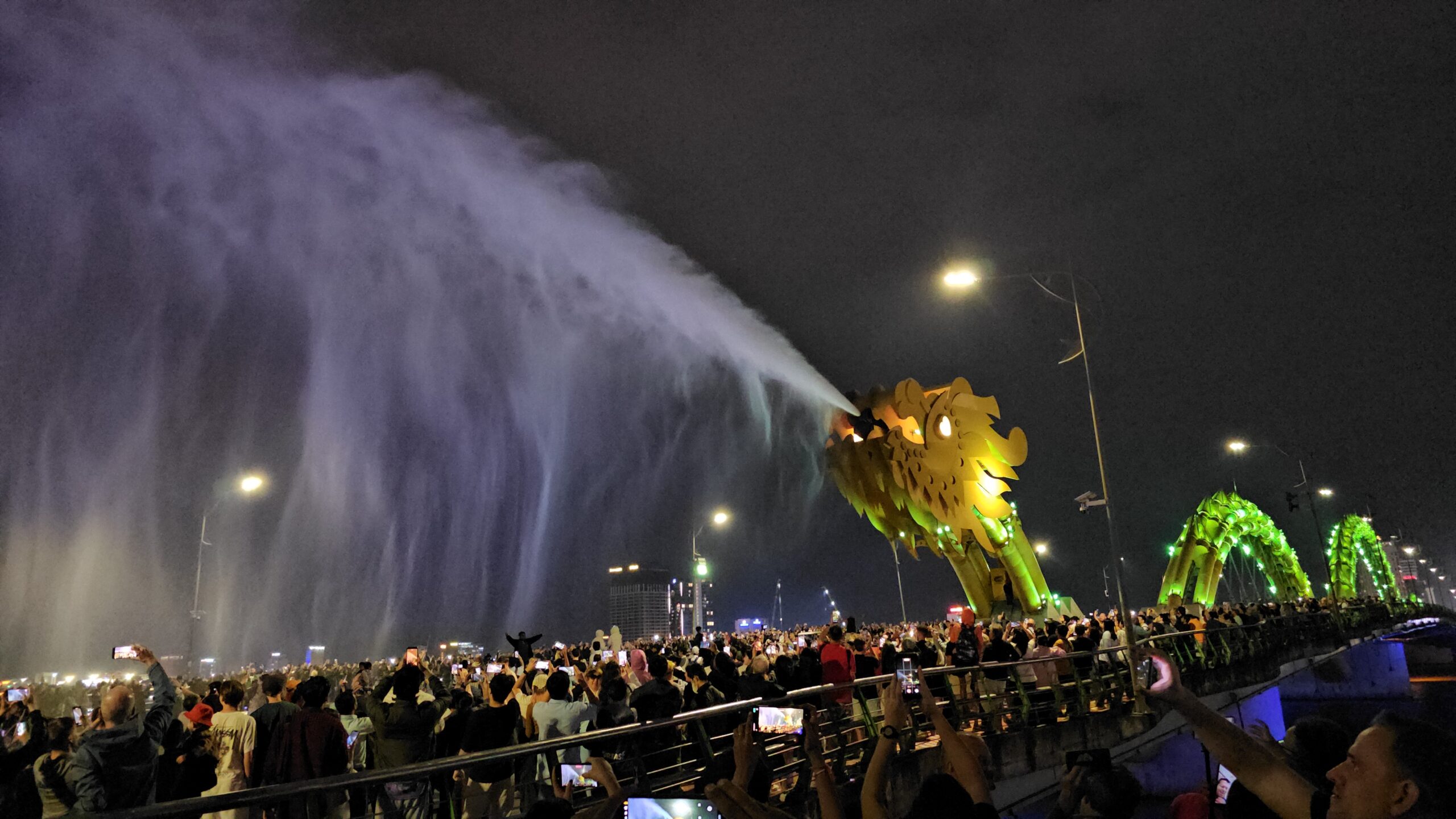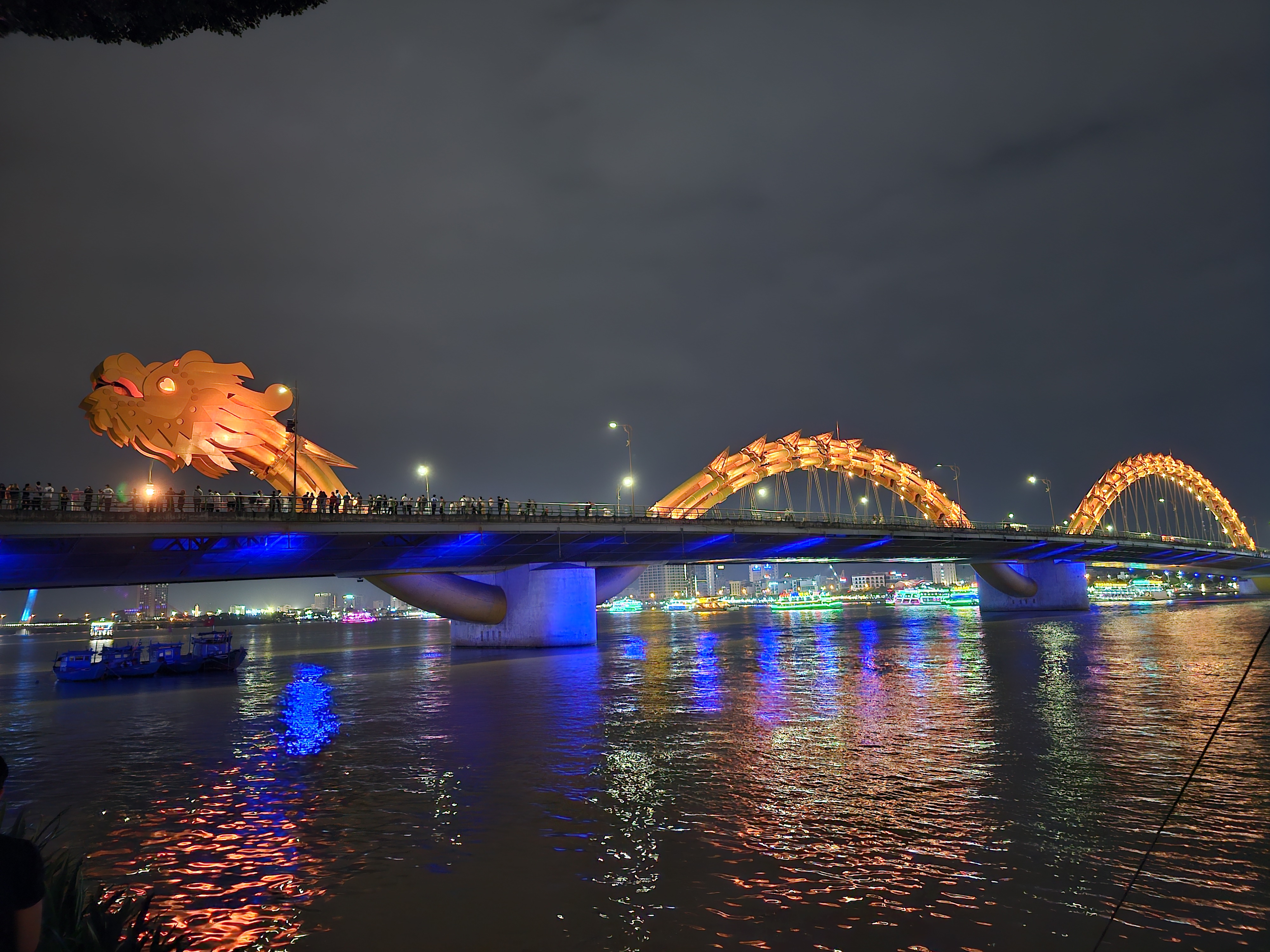 Gegen Abend ging es dann zur berühmten Drachenbrücke – ein Wahrzeichen der Stadt und offenbar auch ein Magnet für die gesamte Bevölkerung Da Nangs plus aller Touristen Vietnams. Eigentlich wollten wir nur die Beleuchtung sehen, aber die Menschenmenge war so dicht, dass man sich fast hätte durchs Publikum buddeln müssen. Dann fiel uns auf, dass in 10 Minuten die Drachenshow startet, die jeden Samstag und Sonntag stattfindet – und plötzlich ergab das Gedränge Sinn. Auch auf dem Han River unterhalb der Brücke wimmelte es von Ausflugsbooten, die alle auf einen Logenplatz für das Spektakel hofften. Wir fanden dann einen Platz in der Nähe des Drachenkopfes (quasi erste Reihe, nur ohne Eintritt) und konnten pünktlich die Show beobachten. Erst spuckte der Drache mehrere Feuerstöße – sehr beeindruckend – und am Ende versprühte er Wasser. Die Leute auf der Brücke bekamen dabei eine kleine Dusche ab, ob sie wollten oder nicht. Wellness inklusive, völlig kostenlos.