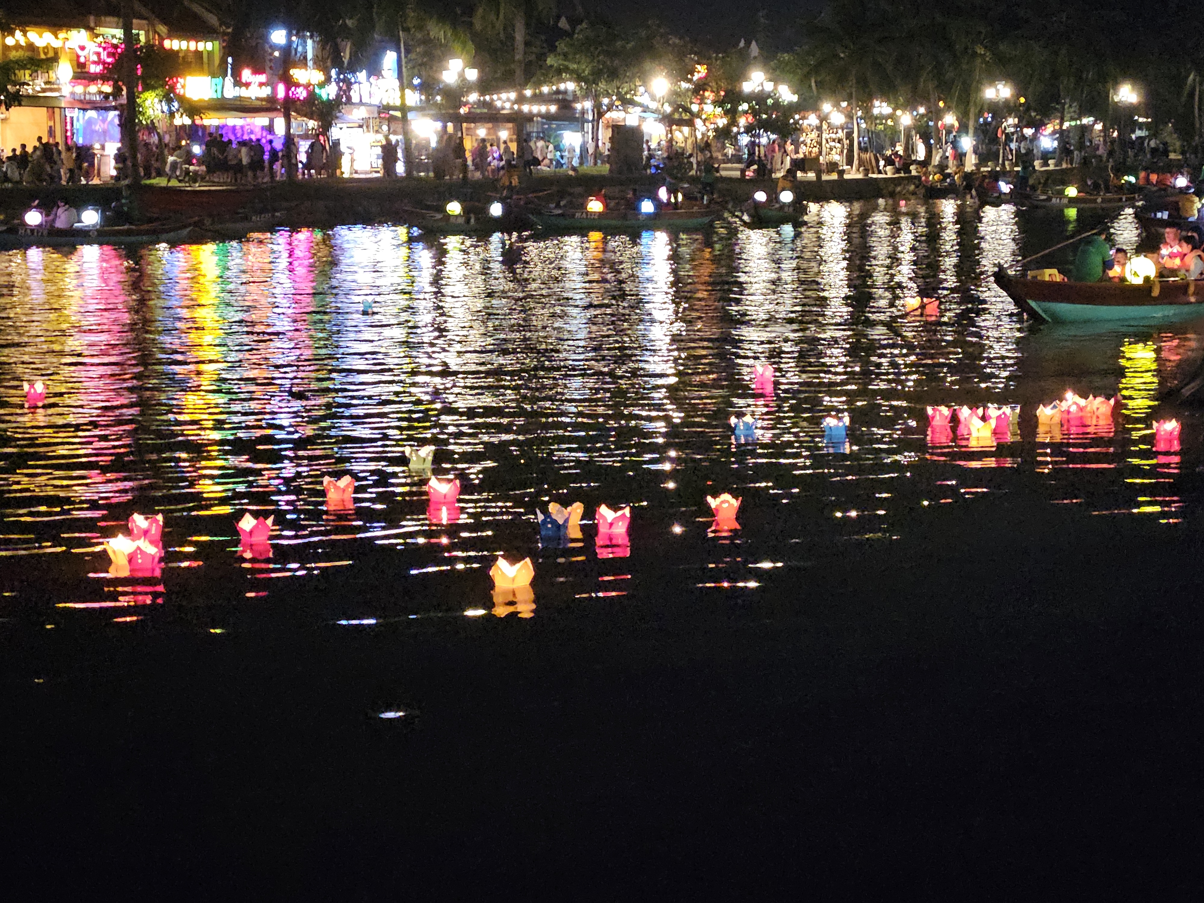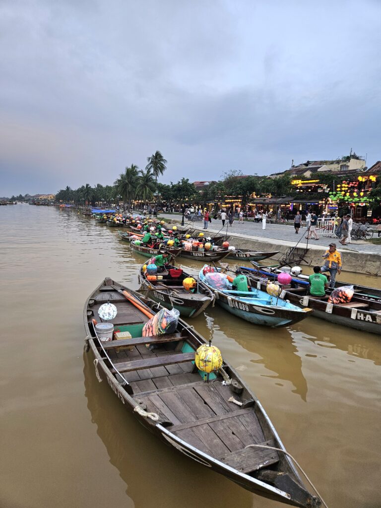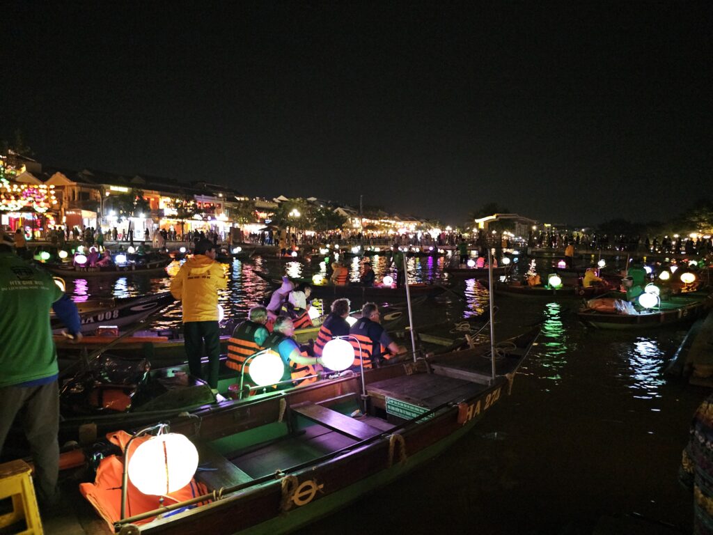 Nach Einbruch der Dunkelheit entfaltet Hoi An dann seinen Zauber: Straßen voller Laternen, Boote mit Laternen, Laternenverkäufer … kurz gesagt: Laternen, wohin man schaut. Man kann sogar kleine schwimmende Laternen kaufen und im Fluss aussetzen. Die ganze Szenerie wirkt so stimmungsvoll, dass es fast kitschig wäre – wenn es nicht so unglaublich schön wäre. Hoi An zeigt sich eben nachts von seiner absolut besten Seite.