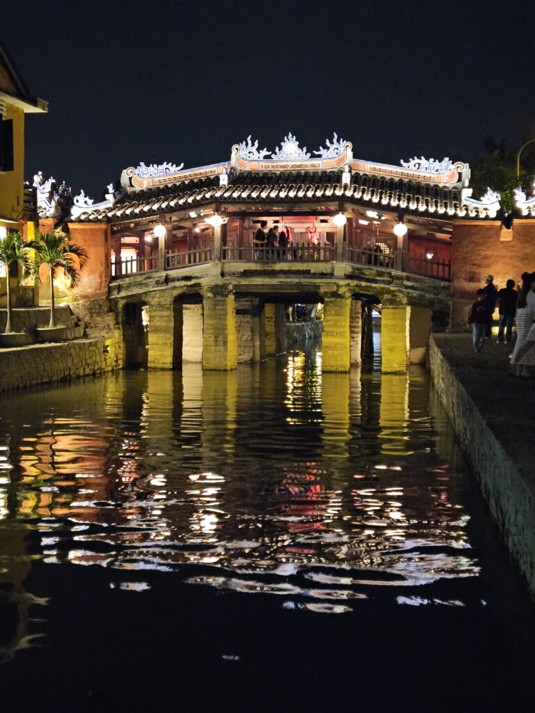 Für den Abend hatten wir dann einen Abstecher nach Hoi An geplant. Die Stadt, die schon im Mittelalter von chinesischen und japanischen Dynastien geprägt wurde, liegt etwa 25 km südlich von Da Nang. Dort gibt es alte Häuser im chinesischen und japanischen Stil, aber auch europäische Gebäude aus der Zeit der Ostindien-Kompanien – quasi eine Architektur-Weltreise auf kleinstem Raum. Ein Beispiel ist die „Japanische Brücke“ aus dem 17. Jahrhundert, die angeblich den japanischen mit dem chinesischen Teil verbinden sollte. So zumindest die Legende – vielleicht hatten die Architekten aber auch einfach Spaß am Brückenbauen.