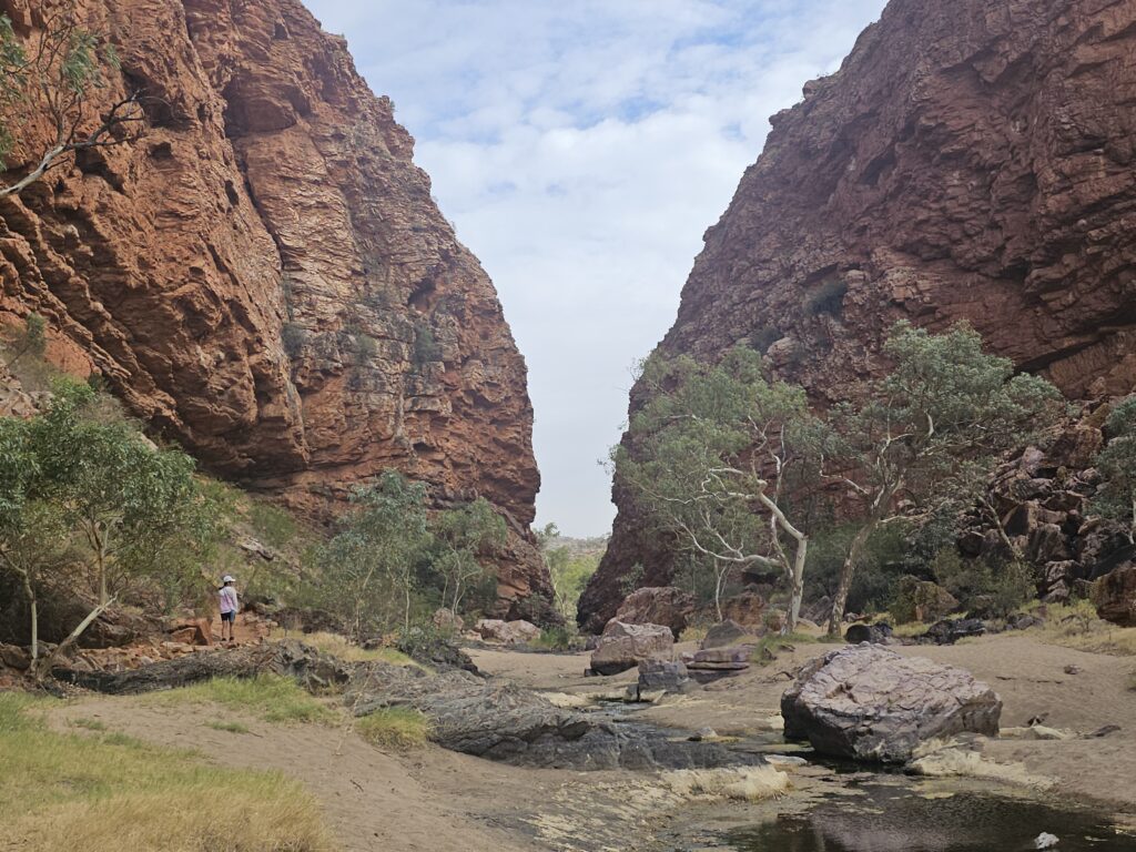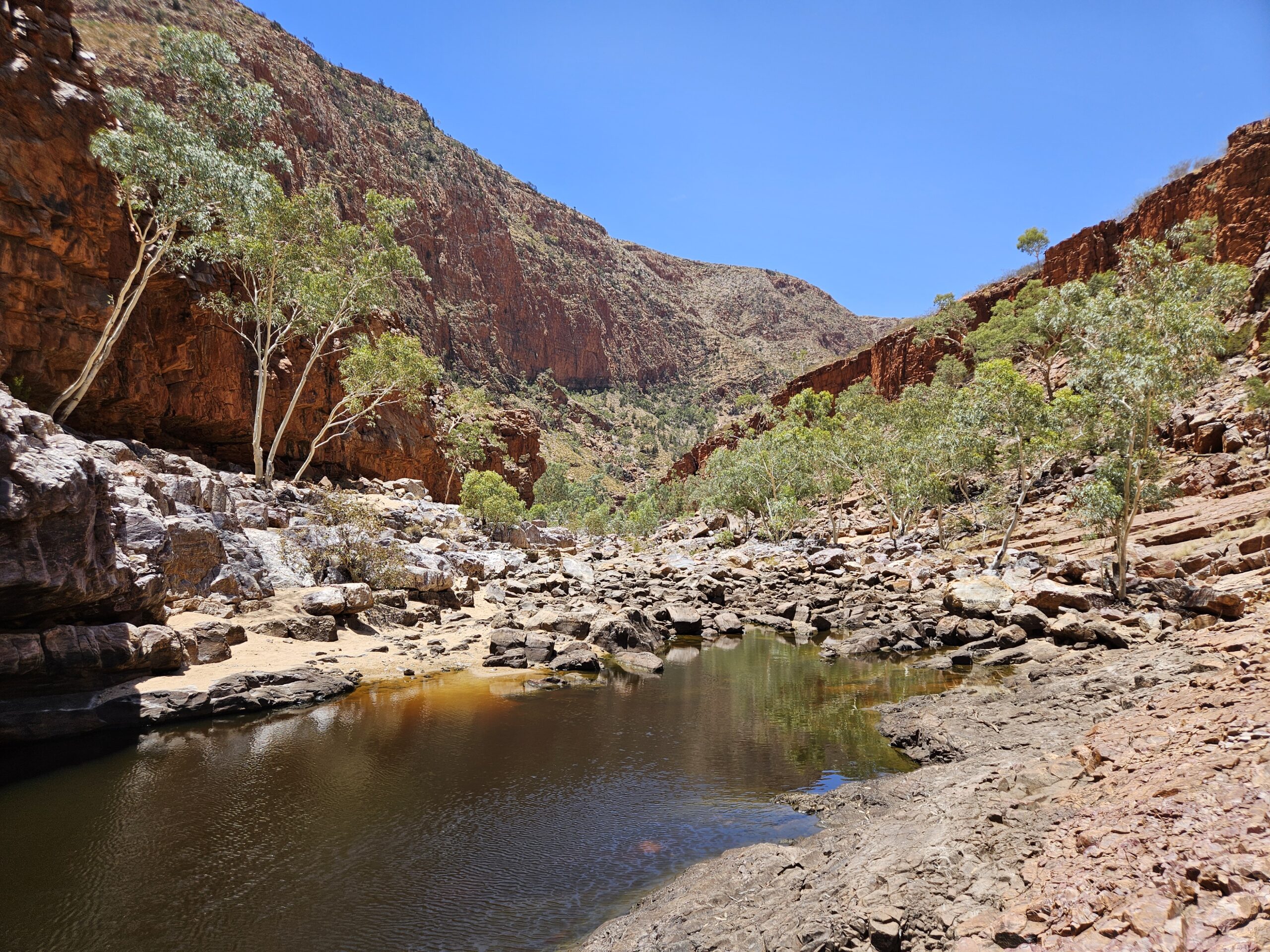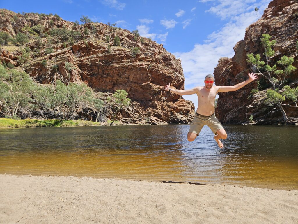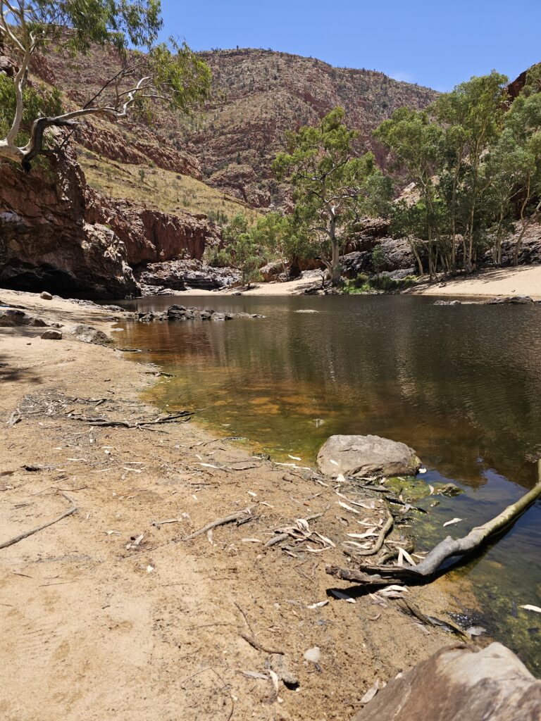 Von dort Spaziergang zum Wanggoolba Creek – glasklarer Süßwasserbach mit blauen Mineralspuren im Sand.