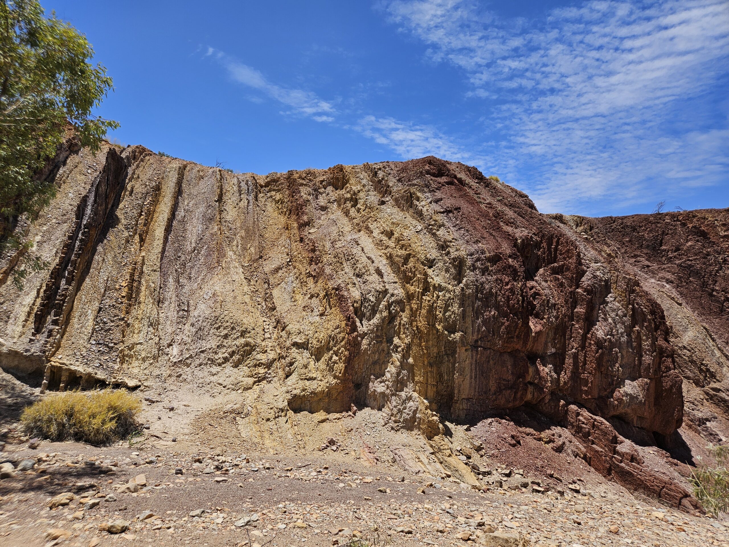 Kurzstopp bei den Pinnacles Coloured Sands – leuchtende Sandsteinklippen in Rot-, Gelb- und Orangetönen, die von den verschiedenen Mineralien im Sand stammen.