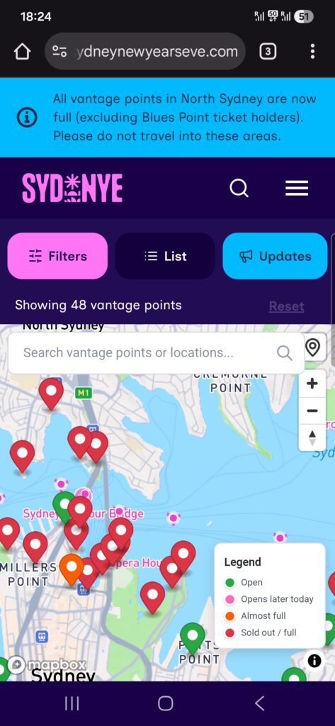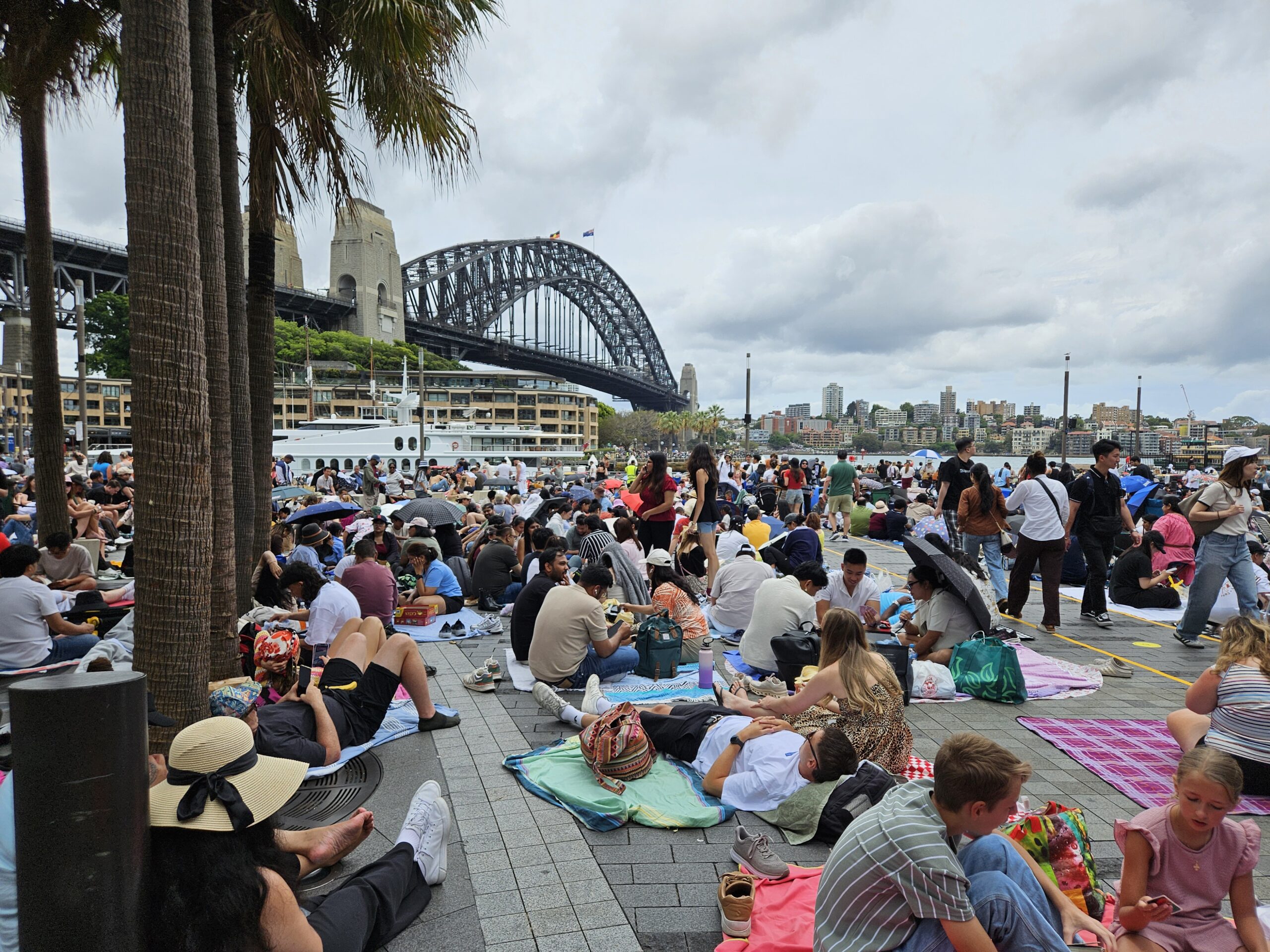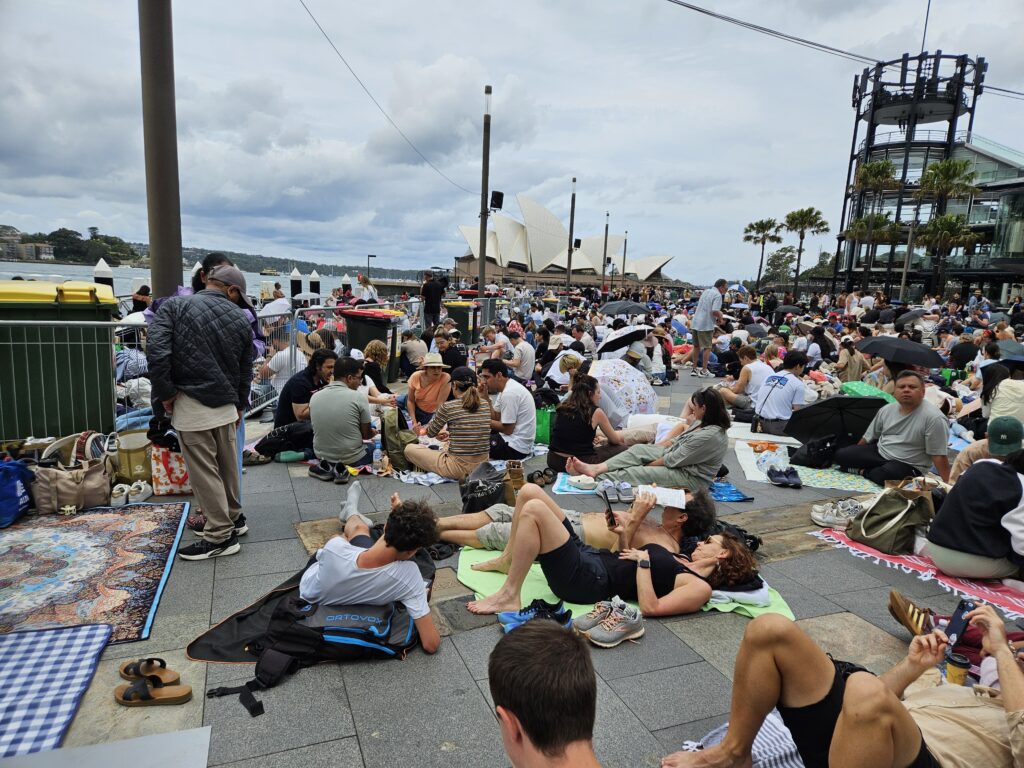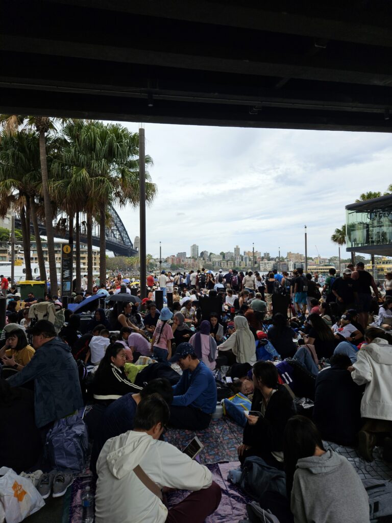 Also starteten wir am Silvestertag schon gegen 12 Uhr, um überhaupt noch eine Chance auf einen der besseren Plätze zu haben. Während der 30-minütigen Zugfahrt Richtung Hafen checkten wir im Minutentakt den Livestatus auf der Website – mit dem ernüchternden Ergebnis, dass unsere Top 3 bereits „rot“ und damit voll waren. Also Plan B: der nächste Spot, der im Netz noch hoffnungsvoll grün leuchtete. Gegen 13 Uhr, zwei Eingangsschleusen und eine Sicherheitskontrolle später, ergatterten wir tatsächlich einen Platz in Campbells Cove – etwa 15 Meter vom Wasser entfernt, mit direktem Blick auf Oper und Harbour Bridge. Jackpot! Um uns herum Massen von Menschen, die sich entweder gemütlich auf Decken oder ausgesprochen luxuriös auf Klappstühlen auf dem harten Betonboden niederließen.