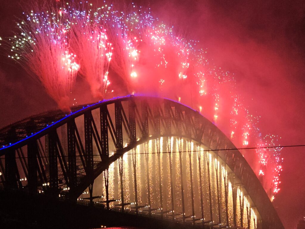 Kurz vor Mitternacht wurde der Countdown auf einen Turm der Harbour Bridge projiziert, und alle begannen wie aus einem Chor mitzuzählen: 3 … 2 … 1. Dann brach die Hölle los – das Hauptfeuerwerk startete. Von Plattformen in der Bay, von der Harbour Bridge und von der Oper schossen Raketen in den Himmel und erleuchteten die Nacht in hundert verschiedenen Farben.