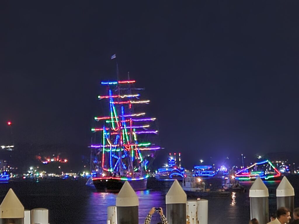 Der Status auf der Website zeigte um 18:30 Uhr, dass bereits 90 % der Aussichtspunkte ausgebucht waren. Das Publikum war bunt gemischt – Inder, Asiaten, Australier, Deutsche und Schweizer –, aber durchweg sehr friedlich. Um 21 Uhr gab es das erste Feuerwerk über der Bay, gedacht für die Familien mit kleineren Kinder, die früh ins Bett müssen