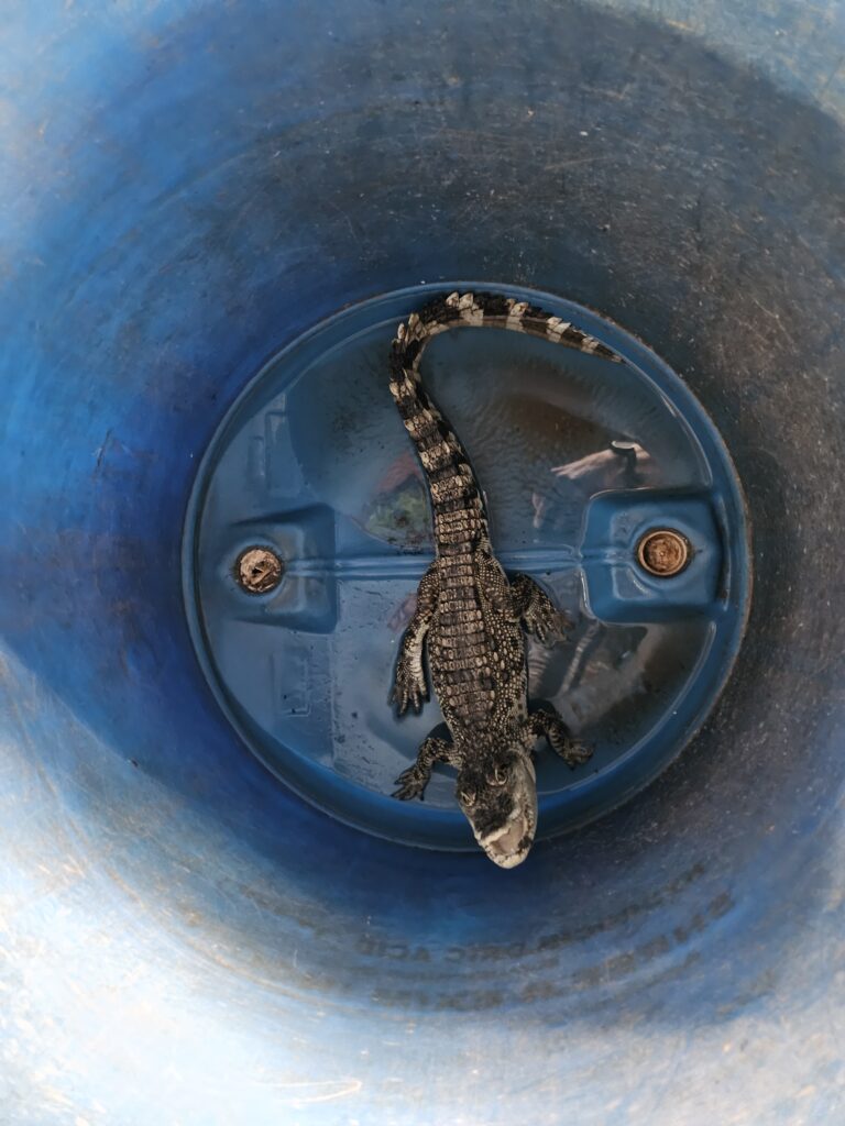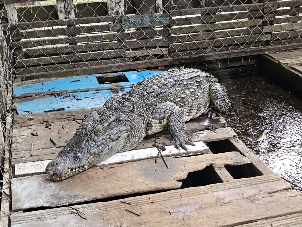 Nach einer halben Stunde war unsere Kanufahrt vorbei, und wir kehrten zum Wasserrestaurant zurück. Der Besitzer zeigte uns noch stolz seine drei Krokodile: zwei etwa 3,5 Jahre alt und eines erst drei Monate jung. Sie werden wegen ihrer Haut und ihres Fleisches gezüchtet. Oh Man … die Menschheit kann manchmal echt gemein sein.