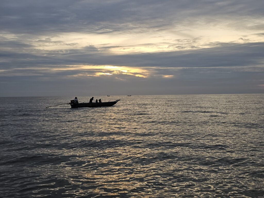Nachdem wir brav seine Getränkebestände geleert hatten, durften wir endlich wieder ins große Boot einsteigen. Dann ging es hinaus auf den See, wo der Motor abgestellt wurde und alle die Ruhe des Sonnenuntergangs genießen wollten. Die Sonne war allerdings schüchtern und versteckte sich hinter den Wolken. Egal – die bunten Wolken und die Weite des Wassers waren trotzdem traumhaft. Wir saßen ganz vorne am Deck, schauten in die Ferne, bis es langsam dunkel wurde. Einfach schön.