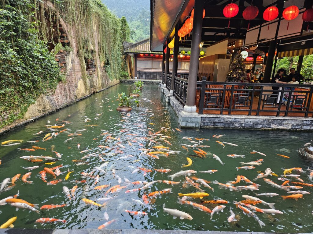 Zum Abschluss zeigte er uns noch die heiligen Quellen. Der Weg nach draußen führte – wie sollte es anders sein – durch ein Labyrinth aus Souvenirständen, das verdächtig an den Ausgang eines IKEA-Marktes erinnerte. Nach dem Souvenir-Labyrinth – wir fanden den Ausgang erstaunlicherweise ohne Panik oder Notruf – entdeckten wir noch einen Obststand. Und dort erfüllten wir uns einen lang gehegten Wunsch: Schlangenfrucht und Durian.